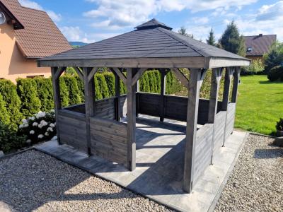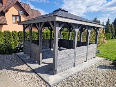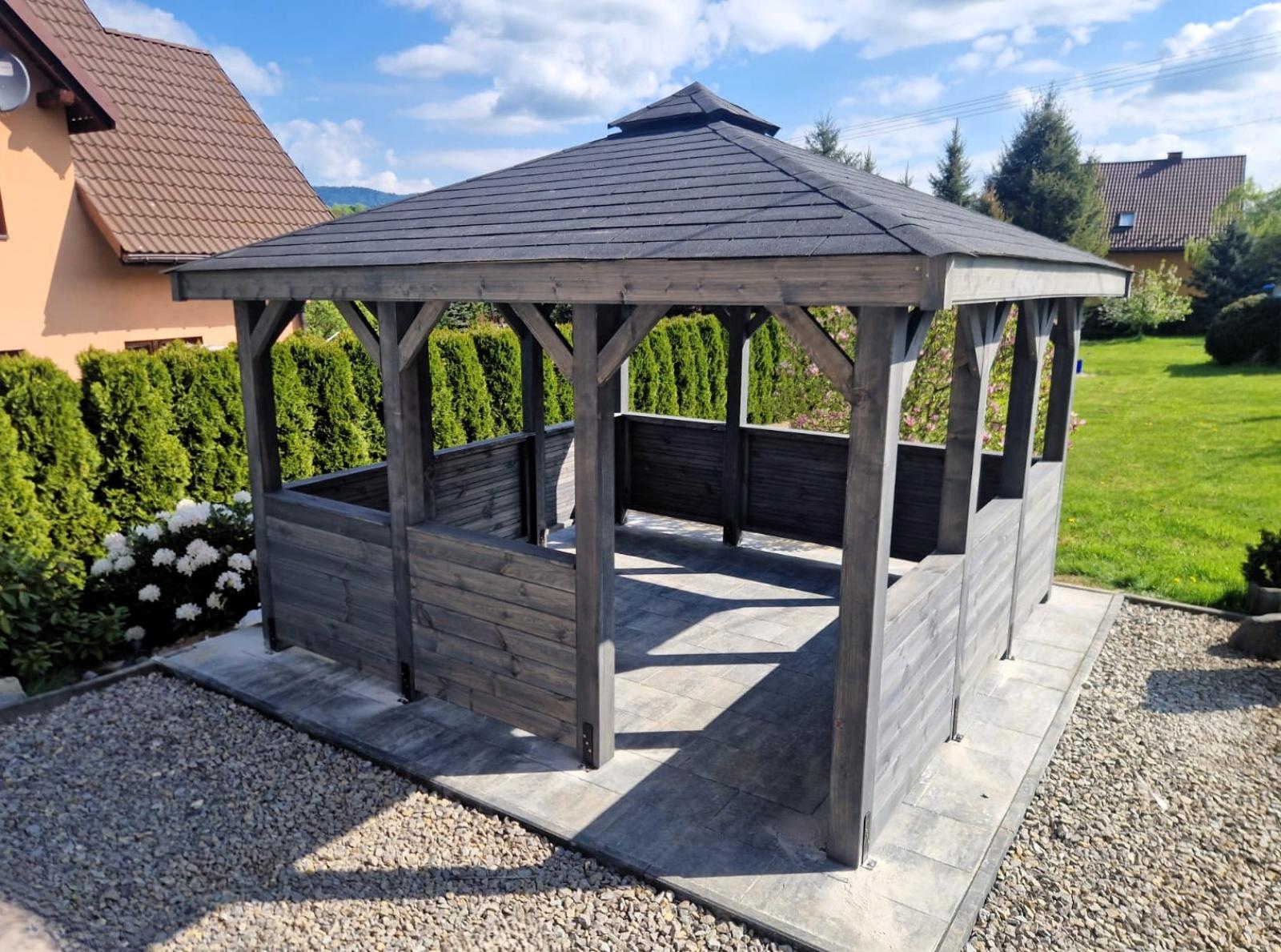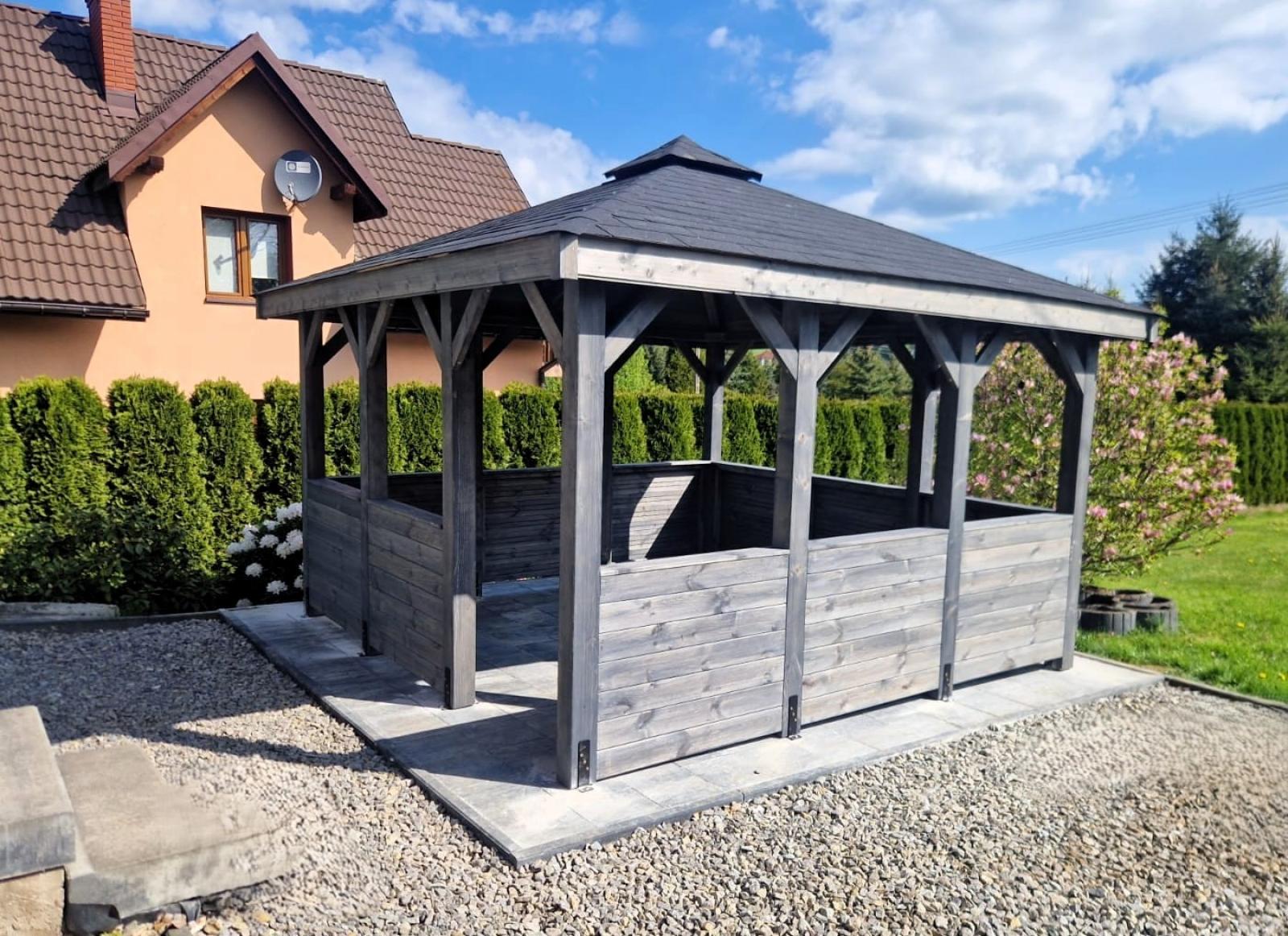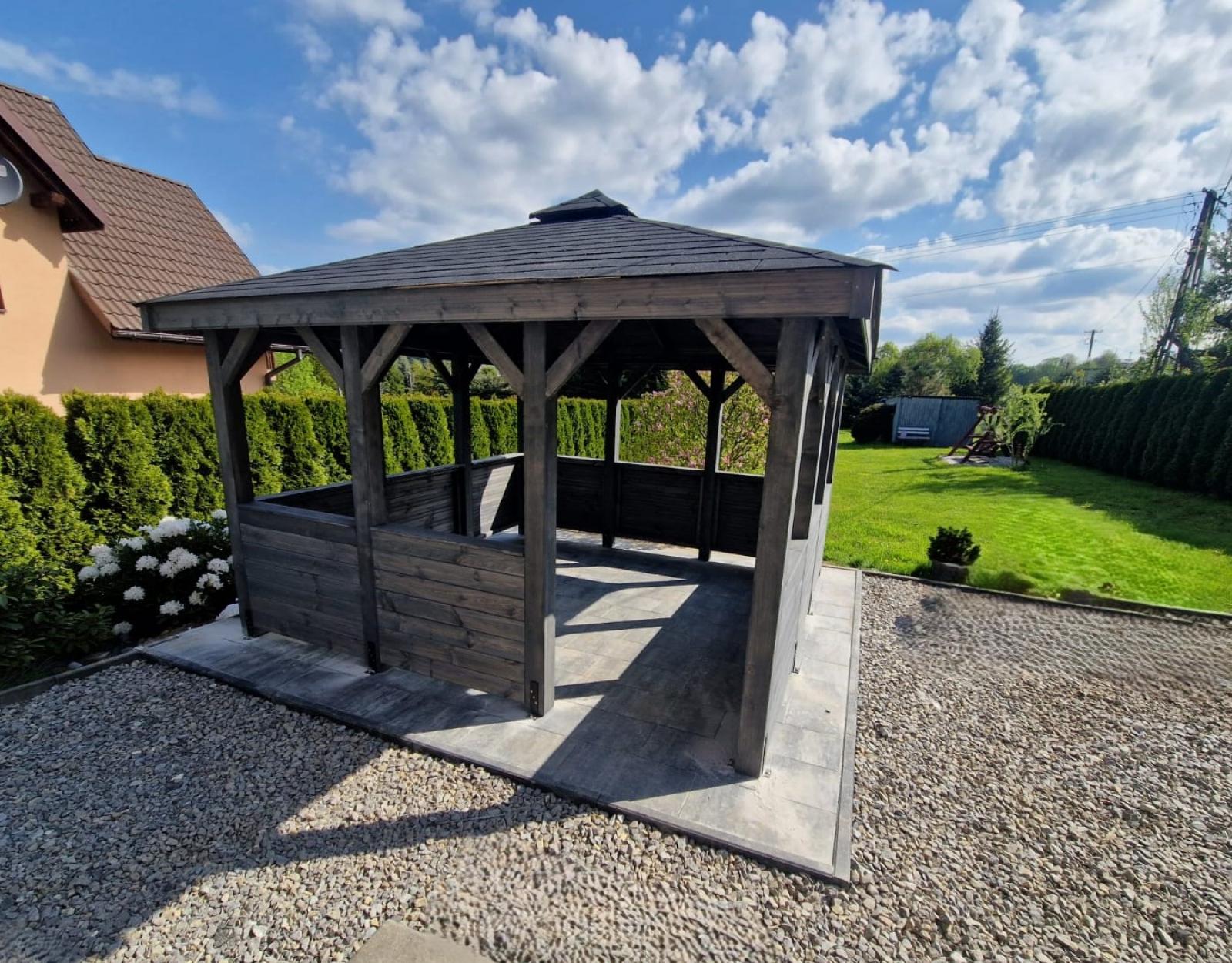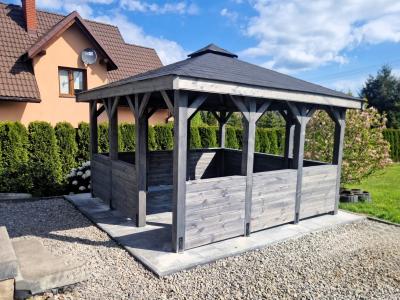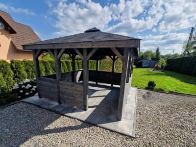 Ta nowoczesna altana ogrodowa jest wykonana z wysokiej jakości drewna, altanka Biesiadna charakteryzuje się solidną konstrukcją i estetycznym wykończeniem. Dach pokryty gontem bitumicznym zapewnia ochronę przed słońcem i deszczem, dzięki czemu możesz korzystać z niej niezależnie od pogody. Otwarta przestrzeń pozwala na swobodną aranżację wnętrza – wstaw stół, ławki lub hamak i ciesz się wypoczynkiem na świeżym powietrzu.
