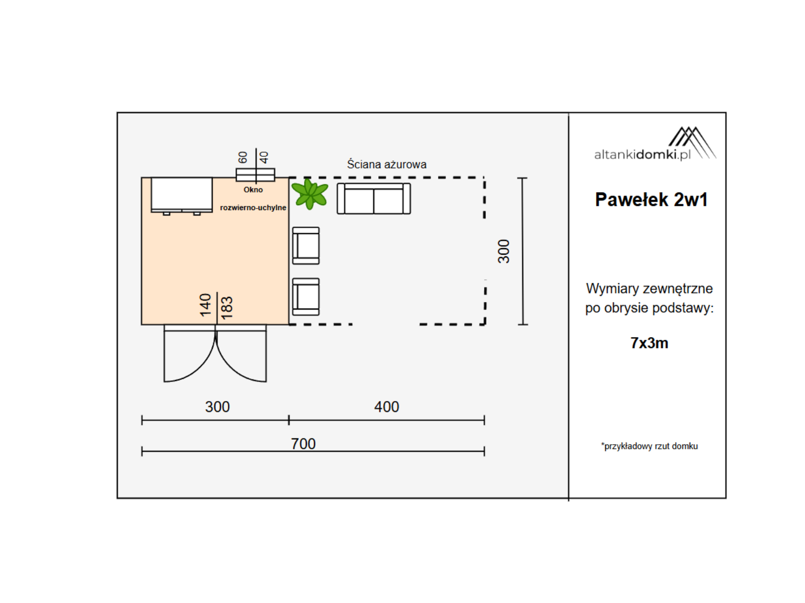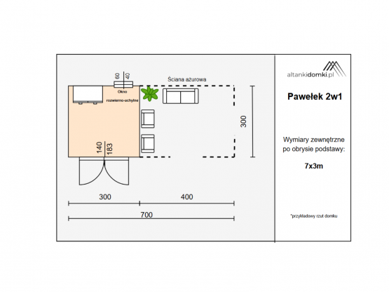 | Pomieszczenia | domek 3x3m altanka 3x4m |