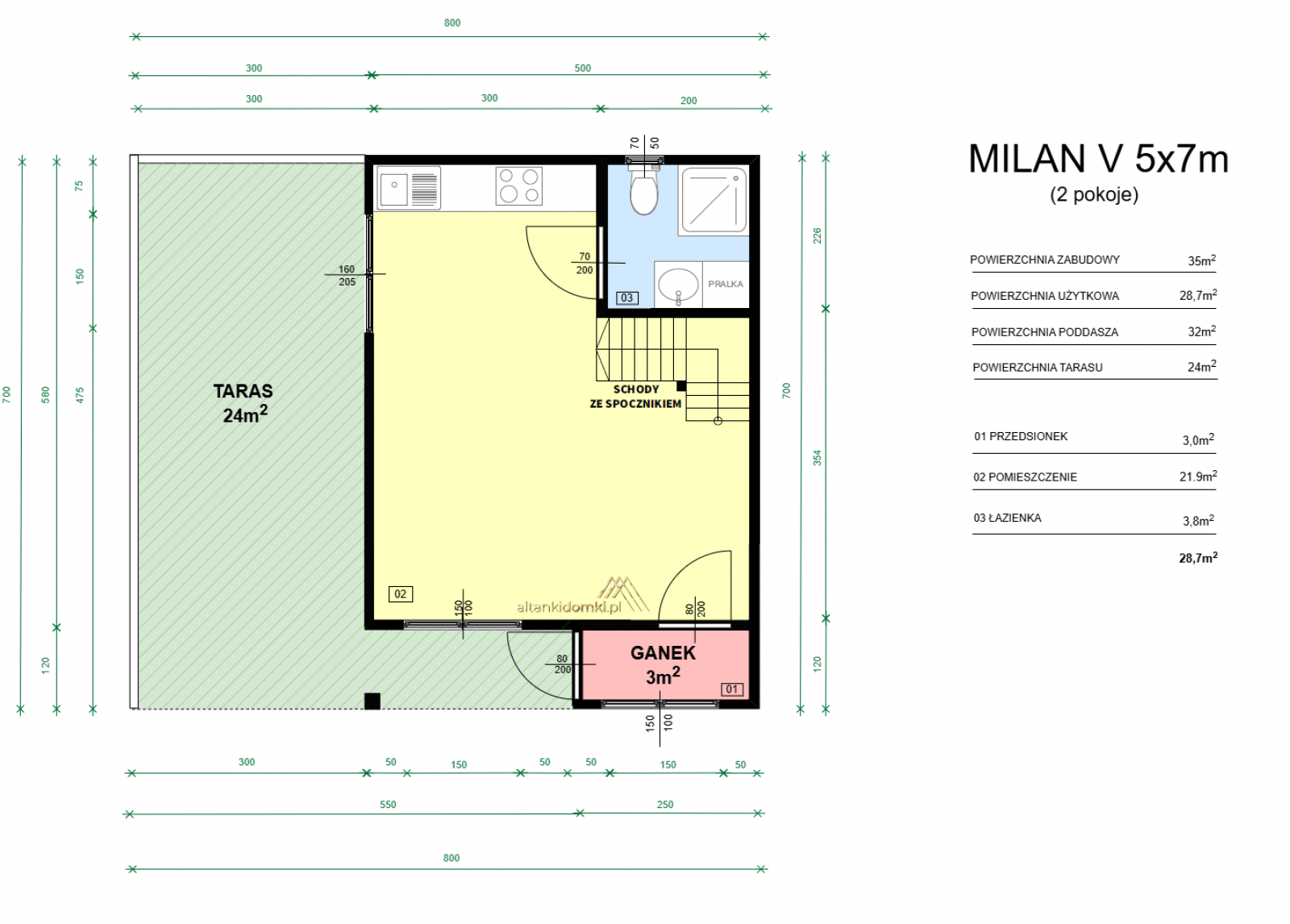 Domek całoroczny Milan V 5x7 m to nowoczesny, drewniany domek o solidnej konstrukcji i eleganckim wykończeniu, idealny do użytkowania przez cały rok. Dzięki ściance kolankowej zapewnia dodatkową przestrzeń użytkową na poddaszu, co zwiększa jego funkcjonalność i pozwala na komfortowe zagospodarowanie wnętrza – na przykład jako sypialnię lub schowek.