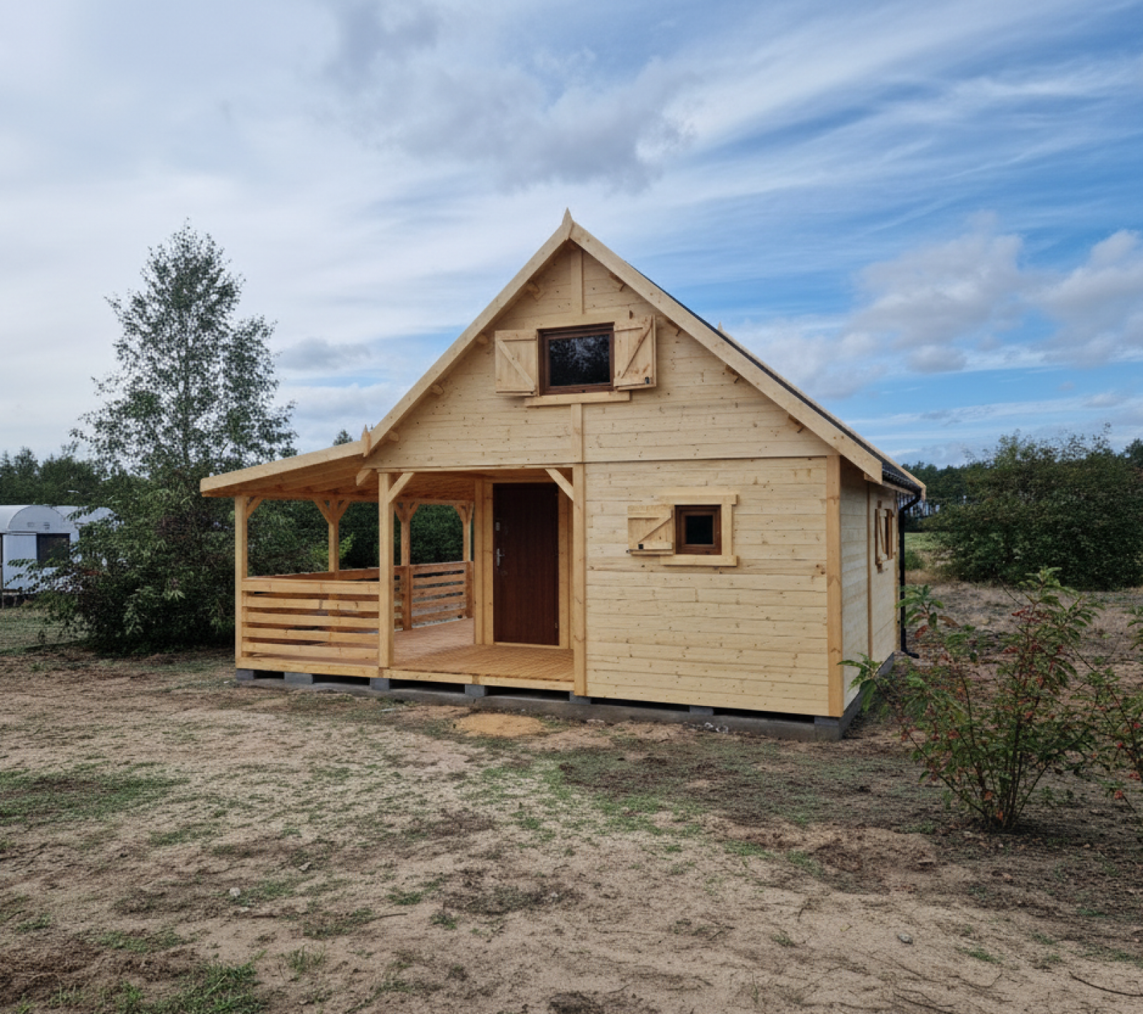 Dla zapewnienia maksymalnej izolacji i bezpieczeństwa, wyposażyliśmy domek w okna PVC oraz solidne drzwi metalowe. Co więcej, do każdego okna dołączone są drewniane okiennice, które nie tylko chronią przed słońcem i zapewniają prywatność, ale i podkreślają tradycyjny, przytulny charakter tego domku rekreacyjnego z tarasem.