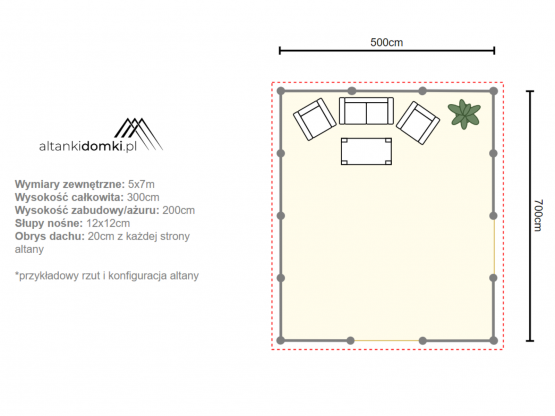 | Wymiary zewnętrzne | 5x7m po obrysie podstawy |