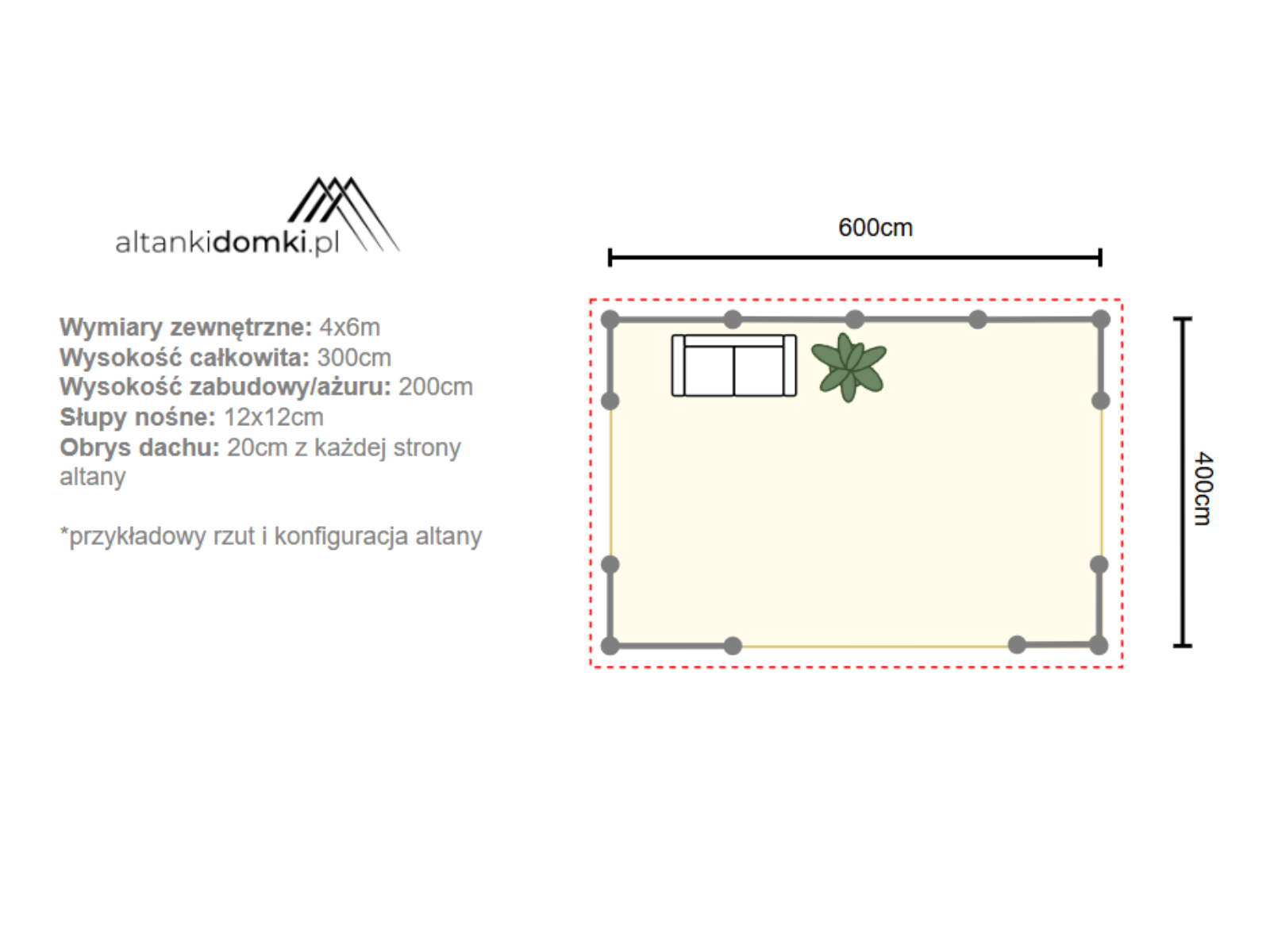 | Wymiary zewnętrzne | 4x6m po obrysie podstawy |