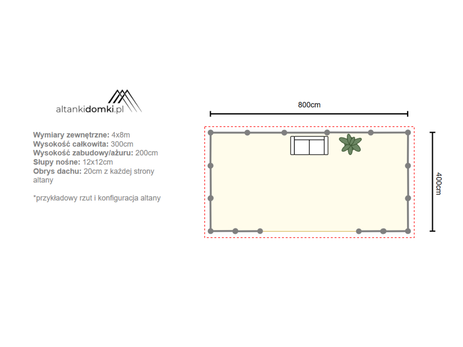 | Wymiary zewnętrzne | 4x8m po obrysie podstawy |
