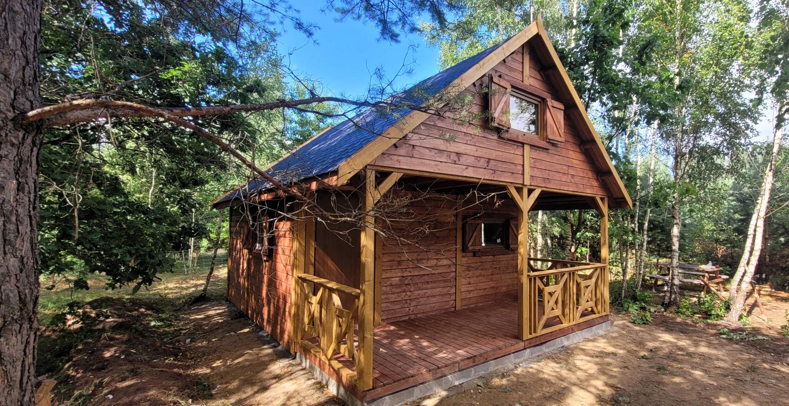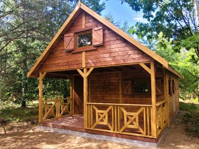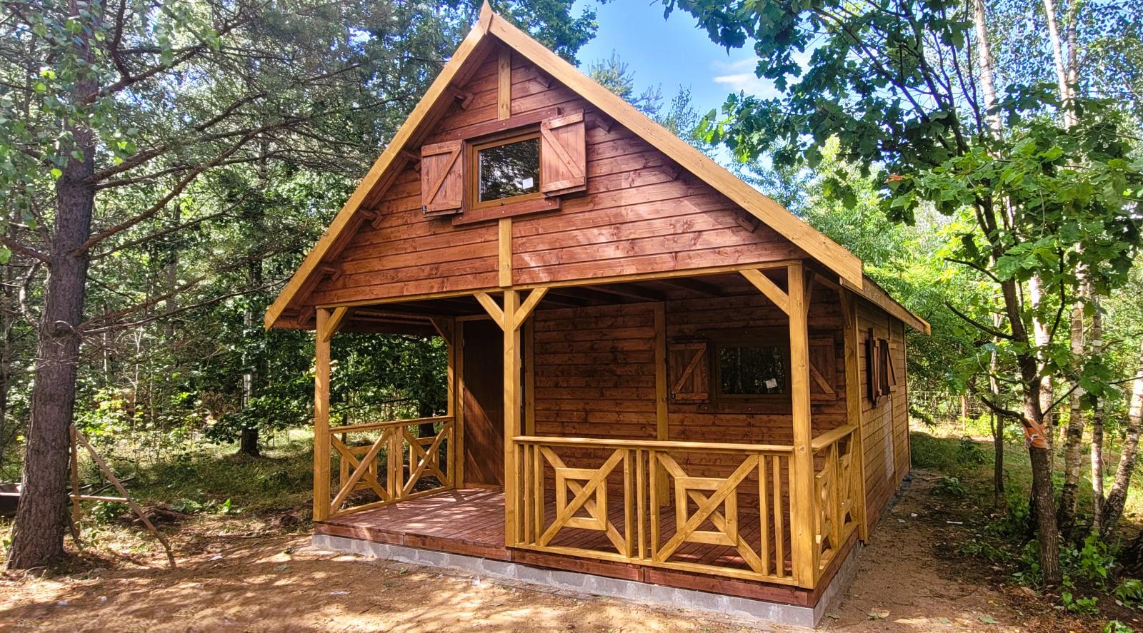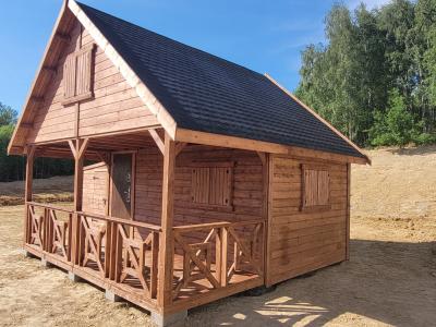 Domek letniskowy drewniany Alan o wymiarach 5x5 metrów jest uroczy i przytulny. Jego dach pokryty jest gontem bitumicznym, co zapewnia doskonałą ochronę przed warunkami atmosferycznymi. Na zewnątrz znajduje się urokliwy taras, gdzie można wypić poranną kawę lub odpocząć po całym dniu aktywności na świeżym powietrzu.